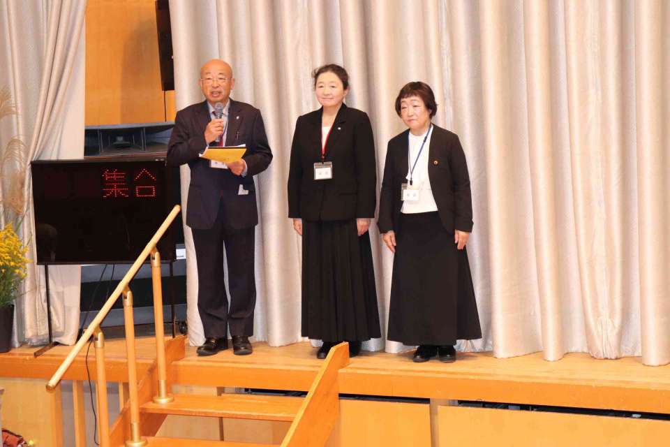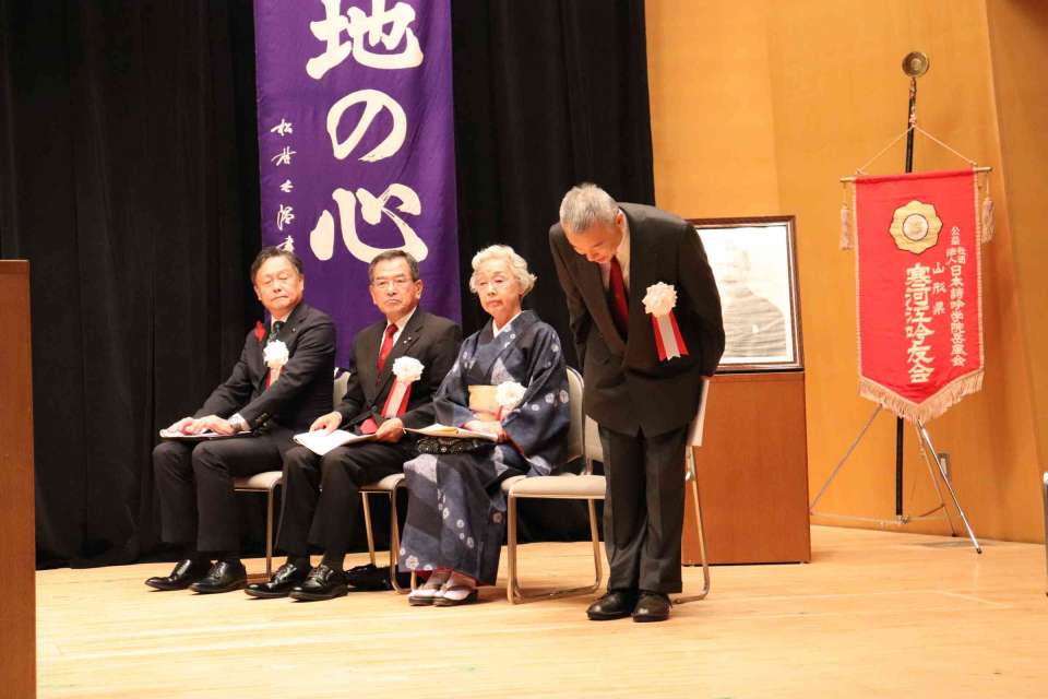 来賓紹介 左から..寒河江市長・齋藤真朗 様 市議会議員・伊藤正彦 様 芸文協副会長 様 尺八伴奏・木村蒼龍 様 |